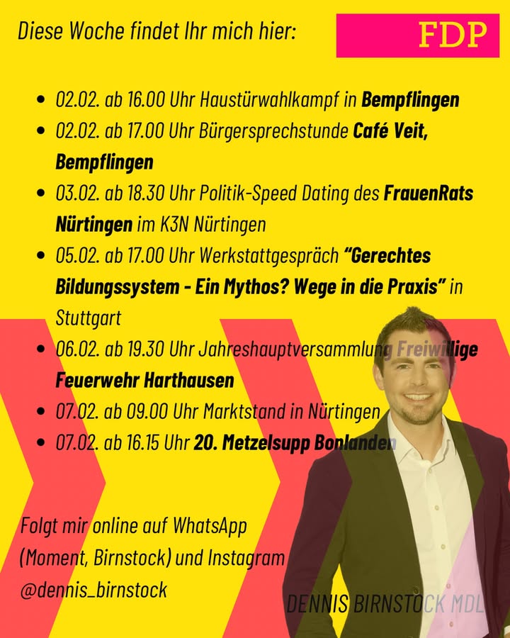 Diese Woche bin ich im Wahlkreis und darüber hinaus unterwegs – im Dialog mit Ehrenamt, Politik und Bürgerinnen und Bürgern. 📍 Alle Termine sind öffentlich 📝 Eine Anmeldung ist jeweils erforderlich bzw. möglich Ob bildungspolitischer Austausch, Speed-Dating, Jahresversammlung oder vor Ort im Wahlkreis, ich freue mich über den direkten Austausch mit Euch. 👉 Anmeldung & Infos 📩 per Direktnachricht 📧 per E-Mail - Haustürwahlkampf und Bürgersprechstunde in Bempflingen - Politik-Speed Dating des FrauenRats Nürtingen - Werkstattgespräch „Gerechtes Bildungssystem - Ein Mythos? Wege in die Praxis“ in Stuttgart - Jahreshauptversammlung der Freiwilligen Feuerwehr Harthausen - Markstand in Nürtingen - 20. Metzelsupp Bonlanden Ich freue mich auf gute Gespräche! Im Übrigen, auf meiner Homepage dennis-birnstock.de findet Ihr alle weiteren Termine vor Ort. #landtagbw #ltwbw #fdp #feuerwehr