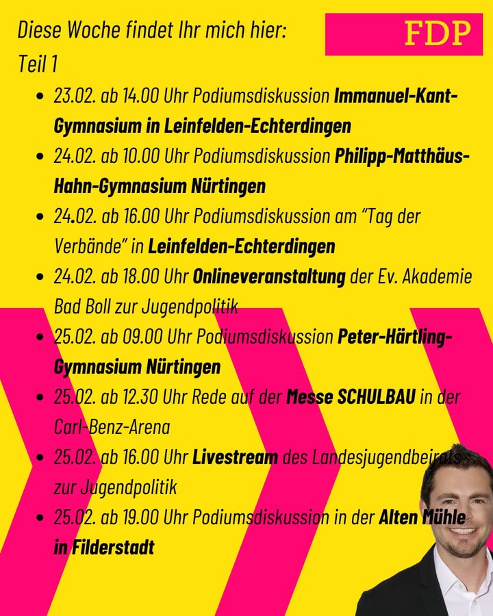 Auf Landesebene haben wir uns einem Aufbruch für Baden-Württemberg verschrieben. Stabile Rahmenbedingungen statt Regulierungswut, mehr Bürgerbeteiligung, ein schlanker Staat, Entlastungen statt Belastungen – das sind die Ziele, die wir als Kreisverband Esslingen unterstützen. Wir wollen die Lebensqualität im Ländle sichern. Dafür setzt sich unser Wahlkreisabgeordneter im Landtag, Dennis Birnstock ein.