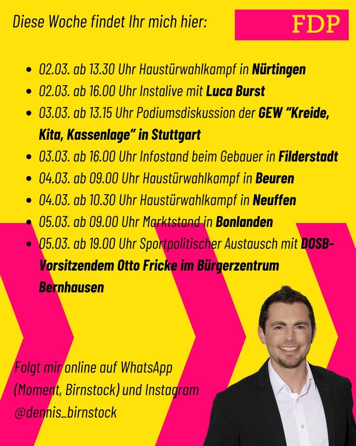 Der direkte Austausch mit den Bürgermeistern im Wahlkreis ist mir besonders wichtig, da man hier sehr schnell erfährt, wo die Herausforderungen vor Ort liegen und mit welchen Sorgen und Wünschen sich die Bevölkerung an die Kommunalpolitik wendet. Denn dort trifft Politik auf Realität. 🏛️ Für mich hört Politik aber nicht an der Wahlkreisgrenze auf. Deshalb bin ich beispielsweise auch im regelmäßigen Austausch mit Bürgermeister @matthias_ruckh aus #Wolfschlugen . Vielen Dank für den immer guten Austausch und auf weiterhin gute Zusammenarbeit. 😊 Vielleicht hat der Wahlkreis Esslingen, zu dem auch Wolfschlugen gehört, ja bald auch einen eigenen FDP-Landtagsabgeordneten 😉 Einen motivierten Kandidaten dafür haben wir jedenfalls schonmal: @tobias.fdp 💛 #ZurückAufVorwärts #Landtagswahl2026 #PolitikTrifftRealität #FDP